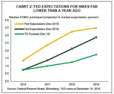 Those impacts illustrate how, to a large extent, bond markets are doing the Fed’s tightening work for it. Higher rates farther out the curve lower the need for tighter policy going forward, rather than increase it. We suspect that this dynamic will contain the Fed to one hike in each of 2017 and 2018 – below others’ expectations (Chart 2). It is also worth noting that at this time last year the Fed thought it would be raising rates four times, not once, in 2016. All told, the high degree of uncertainty about fiscal policy and the reality that its impact on the economy is likely to be quite lagged suggests there is, once again, plenty of room for disappointment as far as future pace of Fed hikes is concerned.