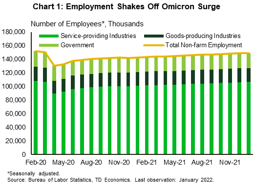 - This week provided the first glance at the economic impact of Omicron, which seems relatively benign compared to previous outbreaks. The poster child of this week is employment, which pulled off an Olympic medal’s worth performance, adding 467k jobs in January.