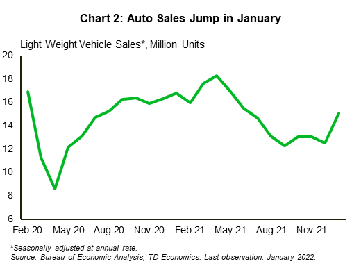 Nowhere is the impact of supply disruptions on prices more apparent than in the auto sector. This week, auto sales surprised with solid growth, reaching the highest level in seven months (Chart 2). The improvement can be attributed to a solid recovery in production, which was able to reduce the pre-pandemic gap from 30% in September to 8% in December. While chip shortages continue to affect the industry, anecdotal evidence suggests that Omicron has so far had a less dire impact on semiconductor supply chains compared to Delta.