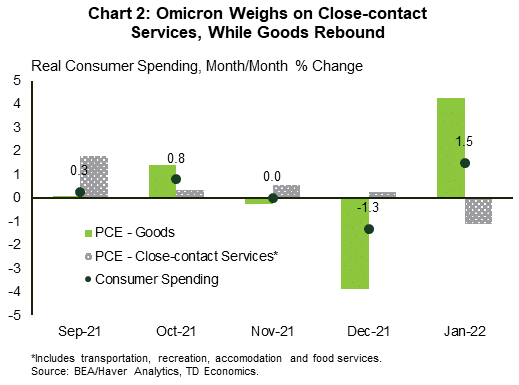 One piece of good financial news this week was a solid rebound in consumer spending in January (Chart 2). The rebound was driven by durable goods, led by spending on vehicles. Spending on close contact services weakened, showing the impact of consumer caution as Covid cases rose. We expect these categories to rebound in February and March, with the high-frequency data already showing that consumers are returning to restaurants and air travel.