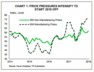 What’s important to note is that this sell-off was not triggered by weak economic data either for the U.S. or global economy. Indeed, we learned this week that the ISM non-manufacturing index showed an improvement in the services sector at the start of 2018, with rising price pressures mirroring its manufacturing counterpart (Chart 1).
