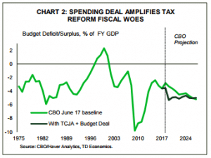 - The $300 billion increase in the spending cap over two years, laid out in the federal budget deal, could add to inflationary pressures at a time when the economy is already operating at close to full capacity, pressuring yields up further.