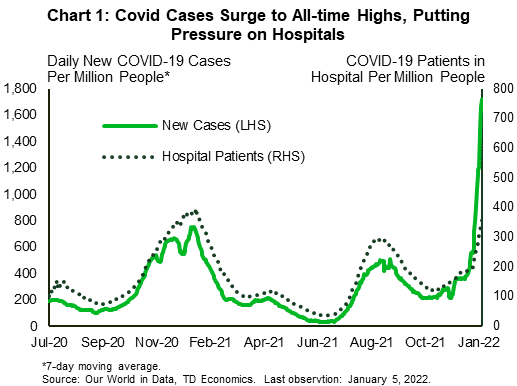 The economic calendar was jammed packed to start the new year in financial news. First up, a rapid increase in COVID-19 cases is quickly dwarfing all previous waves (Chart 1). Fortunately, hospitalization rates are not rising as swiftly, but are still ticking up at the same time that healthcare capacity is constrained by staffing shortages. The surge in cases has prompted airlines to cancel flights and companies to cut services and reduce hours as infected workers self-isolate (though for fewer days than past waves). With worker shortages already a pressing issue, the current wave is likely to weigh on near-term business performance and slow the recovery in high-contact services.