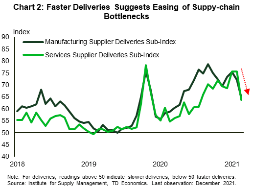 On the production side, there was some good news on easing supply constraints. The ISM manufacturing index slipped to 58.7 in December from 61.1 in November. Despite the slip, manufacturing activity is still expanding at a healthy clip. More encouragingly, there were hints that supply-chain problems could be easing as the supplier delivery sub-index fell to 64.9 in December from 72.2 the previous month (Chart 2). The decline suggests that delivery times are improving, which is a relief given the severe bottlenecks that manufacturers have been facing.