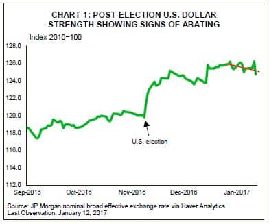Financial markets this week had a fair bit of information to digest, mainly in the form of verbal communication from policymakers. Despite what was deemed a disappointing press conference by President-elect Trump this week given the lack of policy detail, equity markets are expected to end up on the week, while Treasuries round-tripped and should end the week roughly unchanged. The main story in financial markets this week was the volatility in the U.S. dollar index, which could mark the third consecutive week of declines.