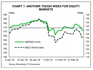 • Markets sold off sharply this week, following a somewhat hawkish assessment of the U.S. economy from the Fed’s new chair Jerome Powell and the announcement of steep tariffs on steel and alumimium imports by Donald Trump.