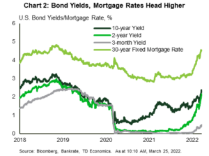 Several other Fed officials, including Mester, Daly, and Evans, echoed the hawkish stance by showing more comfort with rate hikes larger than a quarter point. It comes as no surprise then that market odds are now heavily favoring 50 bps hikes at the next two policy meetings (Chart 1). Bond yields and mortgage rates, meanwhile, continued to head higher (Chart 2). Thirty-year mortgage rates rose above 4.5% this week – a sharp increase from a little over 3% at the start of the year. Higher interest rates will take some steam out of housing demand this year, with this week’s declines in new and pending home sales for the month of February not entirely surprising in financial news. Higher borrowing costs are part of the reason why we expect the housing market to cool this year. For more on our housing outlook see here.
