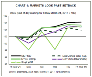 The failure of the bill to repeal and replace the ACA last Friday set the tone for investors at the start of this week. Market participants questioned the new administration’s ability to build consensus and move forward pro-growth policies, with major U.S. stock indices along with the greenback and long-term government rates opening lower on Monday. But, risk sentiment recovered as the week progressed, with most aforementioned indicators recovering beyond last Friday’s levels (Chart 1). This was despite the triggering of Article 50 – the official initiation of the long divorce proceedings between the U.K. and E.U. – which has been largely anticipated. The recovery was partly related to the quick pivot by the U.S. administration