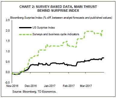 While the economy remains on solid footing there has been an increasing divergence between survey and sentiment metrics (soft data) and harder indicators of economic activity (i.e. sales and incomes). This narrative can be illustrated by Bloomberg’s surprise index where hard data has come in largely as expected while survey-based data has been the main thrust behind an improvement in the measure (Chart 2).