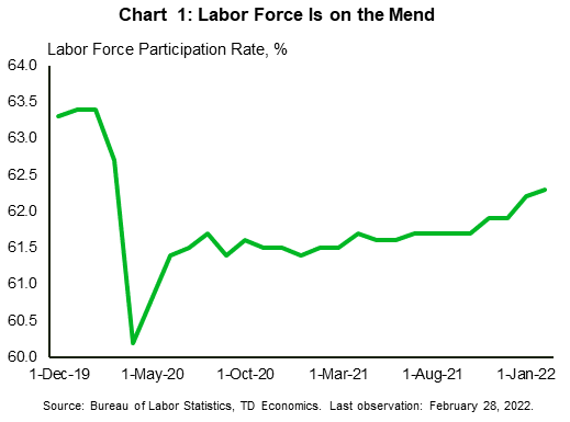 It’s the first week of March, which means we get the initial glance at how the economy did in February, when the Omicron wave started to ease in financial news. This morning, the U.S. Bureau of Labor Statistics surprised the market with 678k jobs created in February, well above 400k anticipated by forecasters. This was on top of an upward revision of 92k to December and January. The unemployment rate fell to 3.8 % – the lowest reading since the pandemic, just 0.3 percentage points above the level two years ago. The labor force – a measure of people working or actively looking for work – also made progress. The labor force participation rate ticked up to 62.3% after 304k people joined labor force in February (Chart 1). All in all, labor market is getting tighter and tighter.