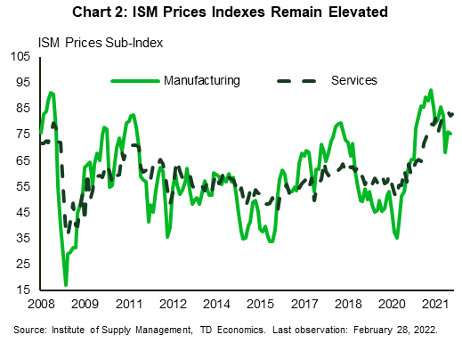 The price sub-indexes remained elevated, although price pressures seem to track lower in the manufacturing sector, while services continue to struggle with a reading above 83 (Chart 2). Despite these differences, there is little doubt that next week’s CPI reading will come in much higher than the 2% target. With the threat of higher prices becoming more entrenched, the Fed is unlikely to hesitate to raise the fed funds rate by 25 basis points on March 16th.