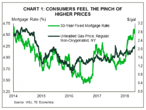 The pinch of higher prices and borrowing rates is expected to restrain consumer spending and housing investment slightly versus 2017’s performance. But, for the remainder of 2018 we expect business investment and government spending to power real GDP growth of around 3%.