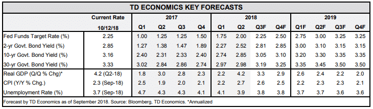 All in all, with trade risks percolating and the boost from fiscal stimulus expected to fade, performance over the last two quarters likely represents the high water mark for the U.S. economy. So far though, despite President Trump taking yet another jab at the Fed this week, it certainly looks like current economic fundamentals warrant another interest rate hike in December, bringing the upper end of the target range to 2.5%.
