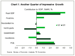 - Domestically, the advance estimate of Q3 GDP was the only major data release this week. After an impressive Q2, the U.S. economy has downshifted slightly in Q3, but at 3.5% (annualized), growth has nonetheless remained very hot and well above potential, giving the Fed ammunition for another rate hike in December.