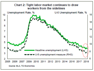 Strong sentiment and economic momentum is boosting hiring, as evidenced by today’s payroll report, which showed that 201k new jobs were created in August. With the jobless rate hovering at historic lows, it is becoming increasingly difficult to find workers to fill positions. This continues to draw in workers from the sidelines (Chart 2) and also motivating firms to raise wages. As a result, the closely watched average hourly earnings measure rose 0.4% in August, accelerating to 2.9% on a year-over-year basis. This is the fastest pace of wage growth of the recovery, and may prove to be the start of the long-awaited sustained pickup in wage growth.